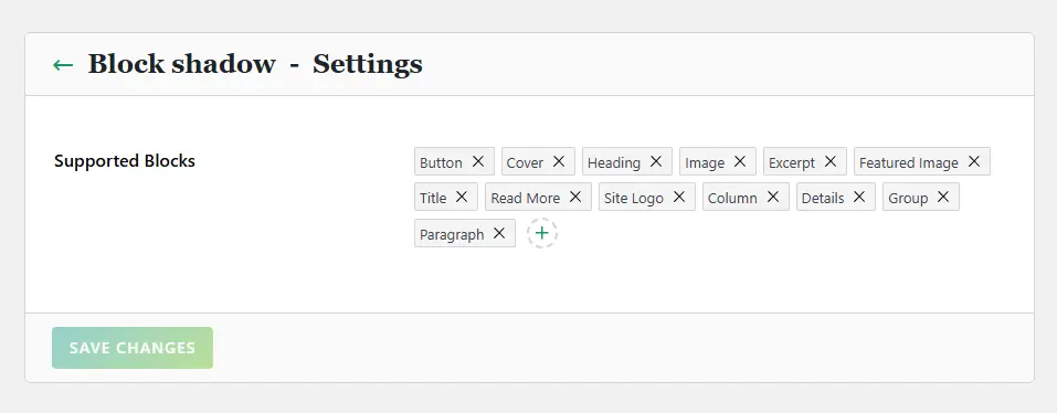 The Blocks Selector allows you to choose which WordPress blocks the module’s functionality applies to. It consists of two parts: the “Selected Blocks Tag Cloud” at the top and the “Block Selector Panel” that appears when you click the plus button next to the block tags.
