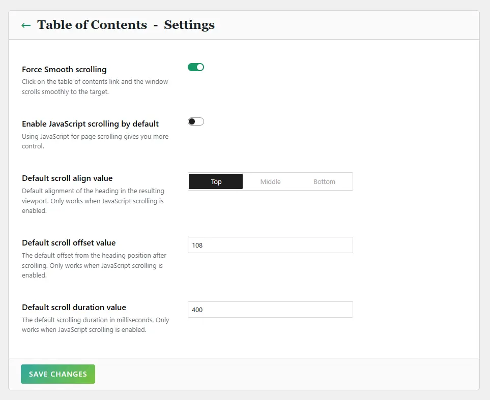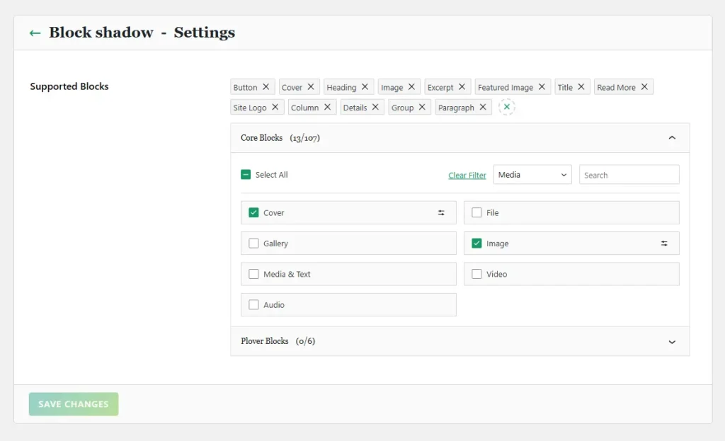 Don’t forget that all changes made in the settings interface (including Blocks Selector selections) must be saved by clicking the Save Changes button at the bottom of the page.
