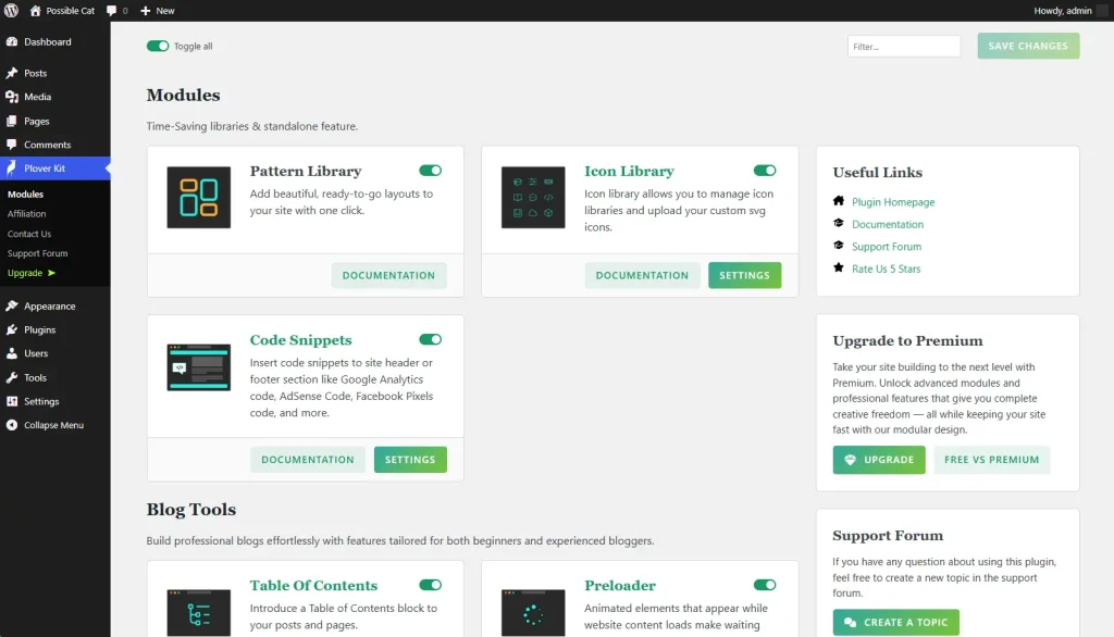 The Plover Kit dashboard is the central interface for managing all modules. Here you can enable/disable modules, access module documentation, configure module options, and quickly navigate to forums, documentation, upgrade pages, etc., via the sidebar. This document will guide you through the various functional areas of the dashboard.