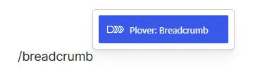 To add the Plover: Breadcrumb block to a page, click the Add block button to open the block inserter pop-up window and choose the Plover: Breadcrumb block.