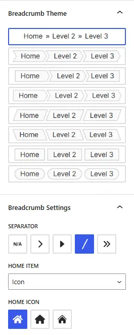 “Home” refers to the item that links to the website’s homepage. Typically the first item in breadcrumb navigation, you can choose to display it as the site title, custom text, or an icon, or not to display the homepage item at all.