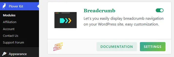 You can visit the module settings via “WordPress Dashboard -> Plover Kit -> Modules -> Breadcrumb-> Settings