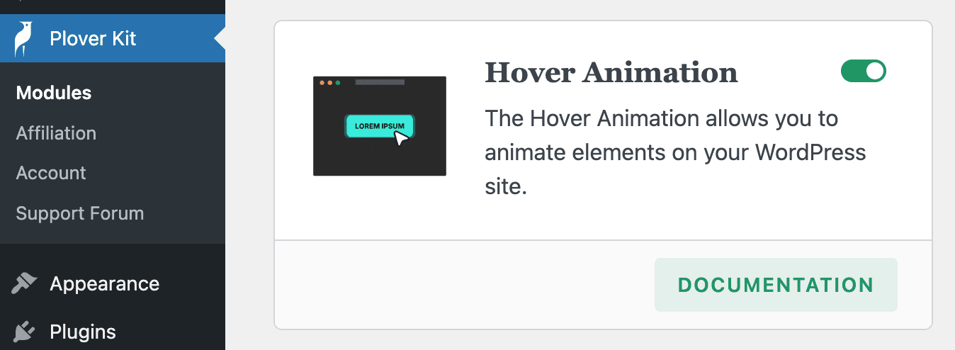 You can enable this module via “WordPress Dashboard -> Plover Kit -> Modules -> Hover Animation
