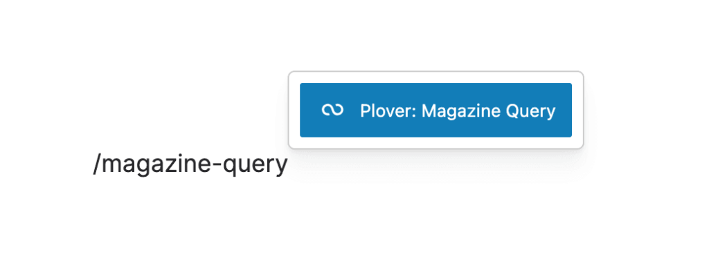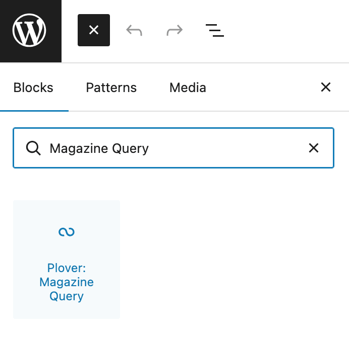 To add the Plover: Magazine Query block to a page, click the Add block button to open the block inserter pop-up window and choose the Plover: Magazine Query block.
