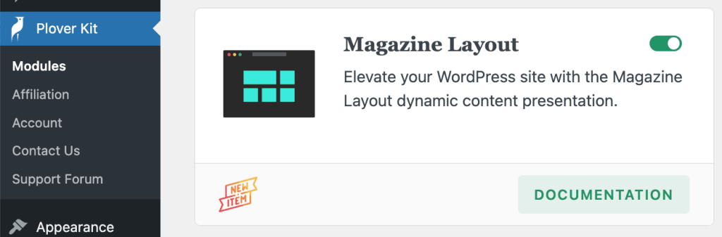 You can enable this module via “WordPress Dashboard -> Plover Kit -> Modules -> Magazine Layout“