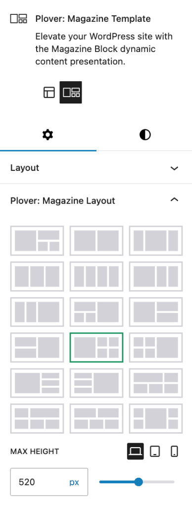 You can modify the magazine layout in the settings sidebar of this block. The height parameter adjusts the overall vertical space occupied by the magazine layout. In the style panel, you can also customize fonts, colors, borders, spacing, and more.