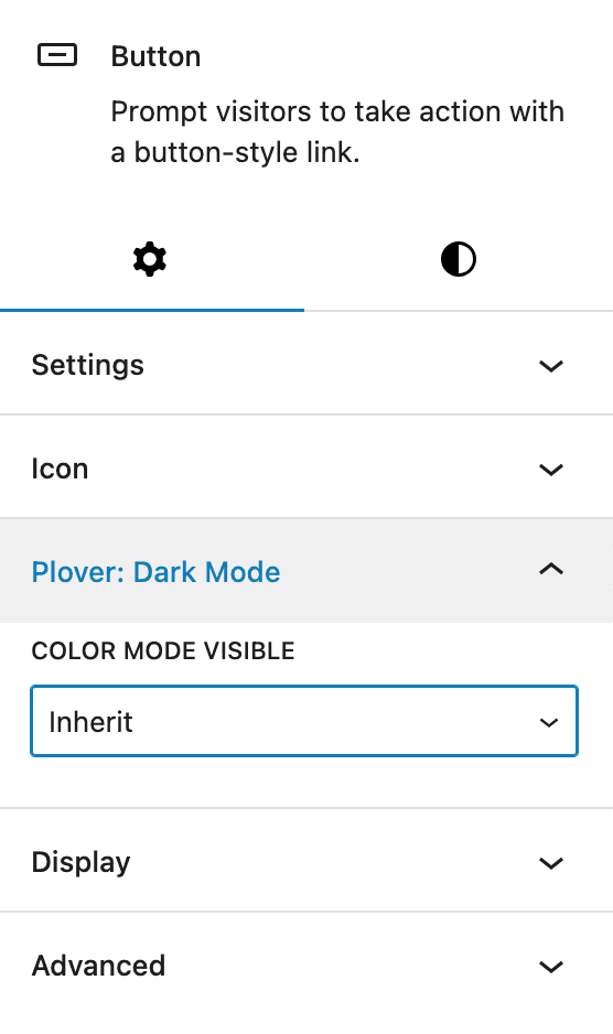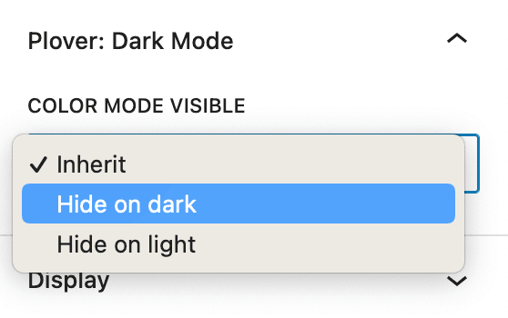 We added a “Plover: Dark Mode” settings panel for all blocks. The “Color Mode Visible” option allows you to control whether a block is visible or hidden in different color modes.